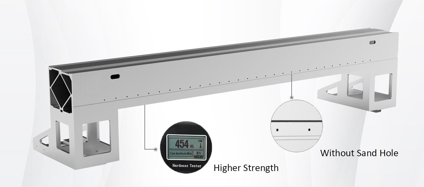 • Machine adopts aviation cast aluminum beam, which is manufactured according to the aerospace standards and extruded with 4300 tons pressure.